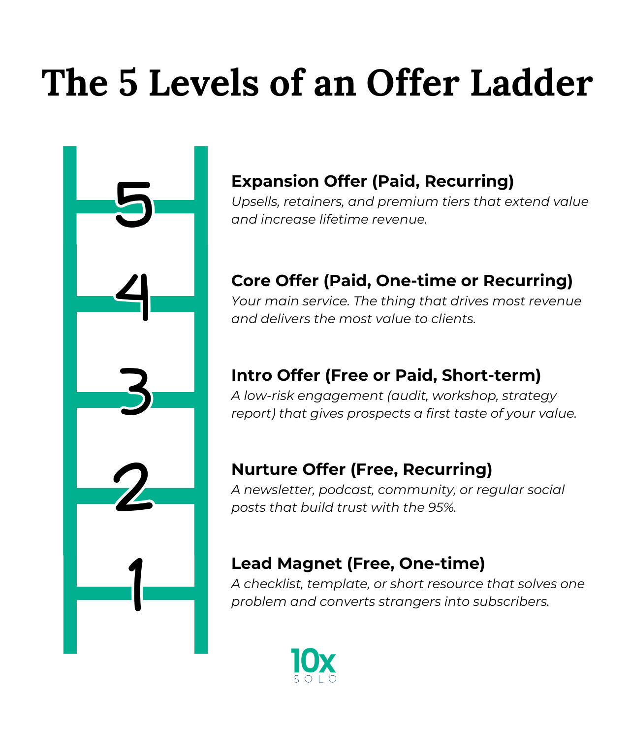 The bare minimum: You only need one rung to start: your Core Offer. Add the others only when you hit specific bottlenecks: